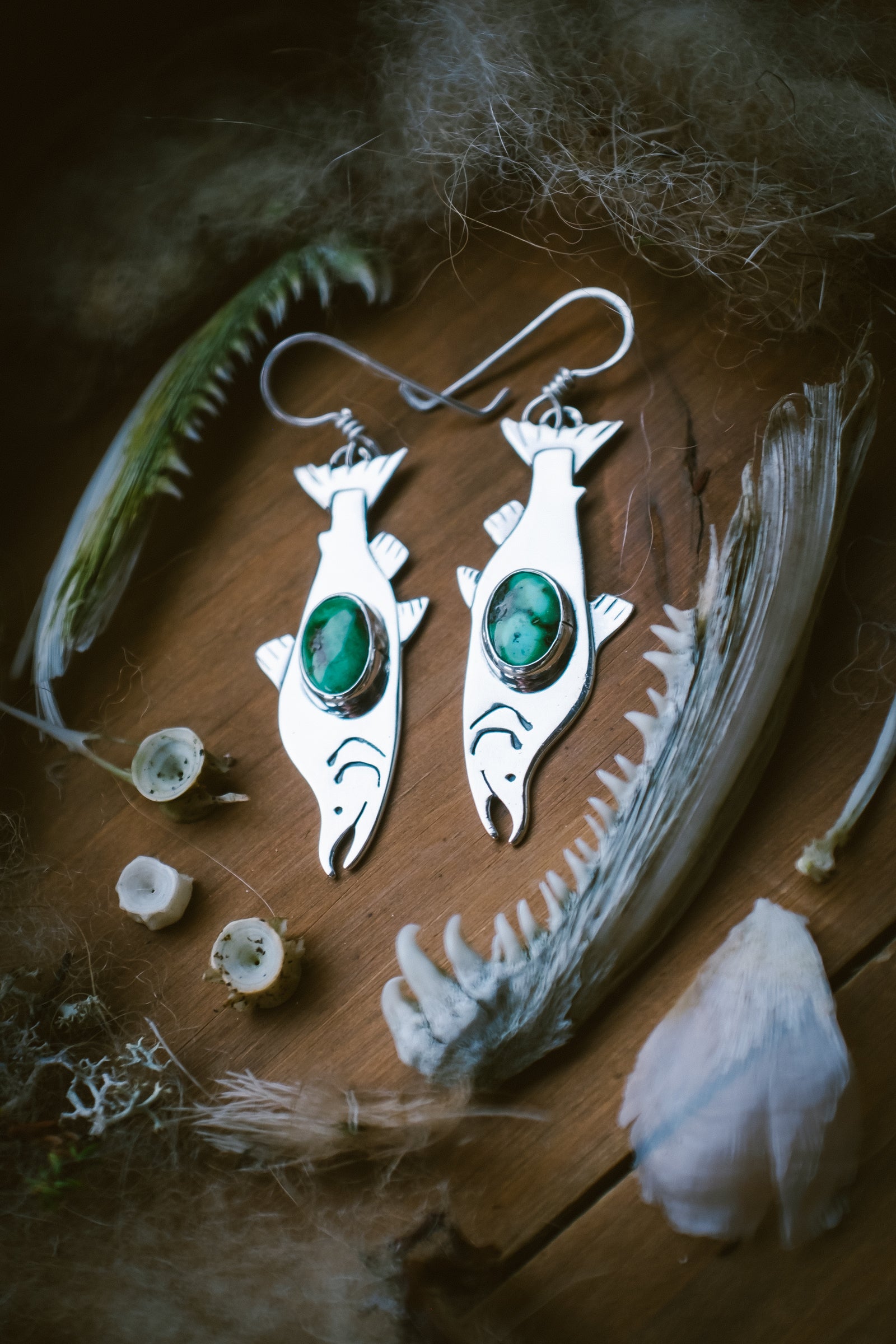 My beloved sockeye salmon earrings polished to a mirror finish. These earrings are incredibly lightweight and each fish measures at just under two inches long. Every component is handmade, down to the ear wire. Featuring a pair of high grade Sonoran Gold turquoise.