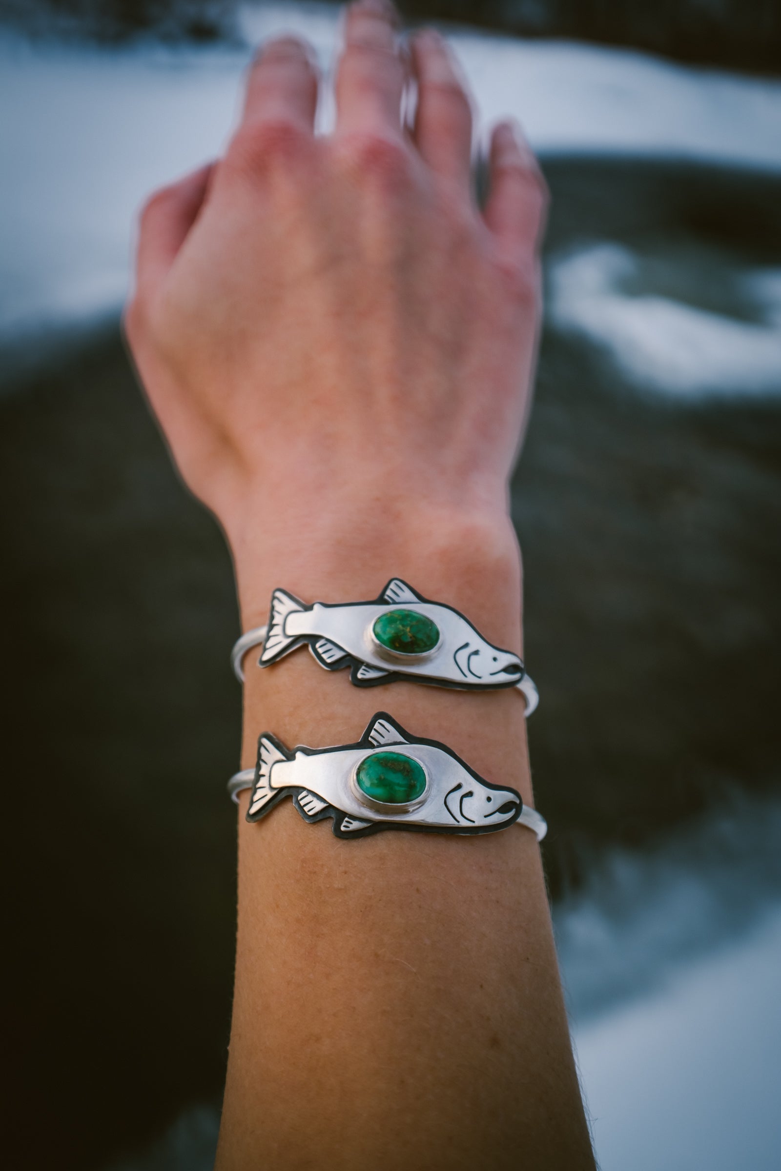 Handcrafted out of sterling silver wire, these sockeye salmon cuffs are five inches long with a one inch wide opening. Each stone featured on top of the sockeye salmon is a unique oval cut of high grade Sonoran Gold turquoise.