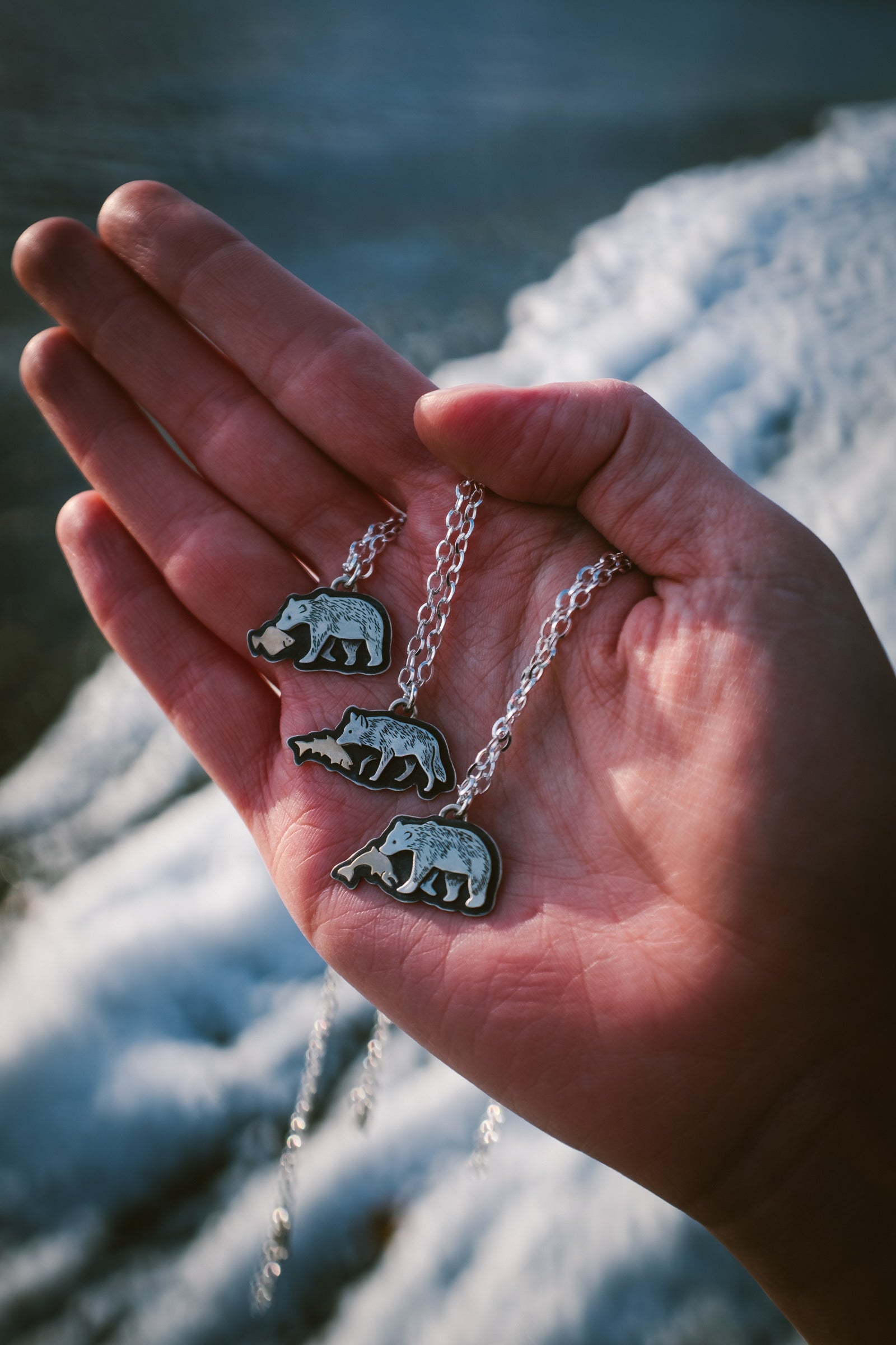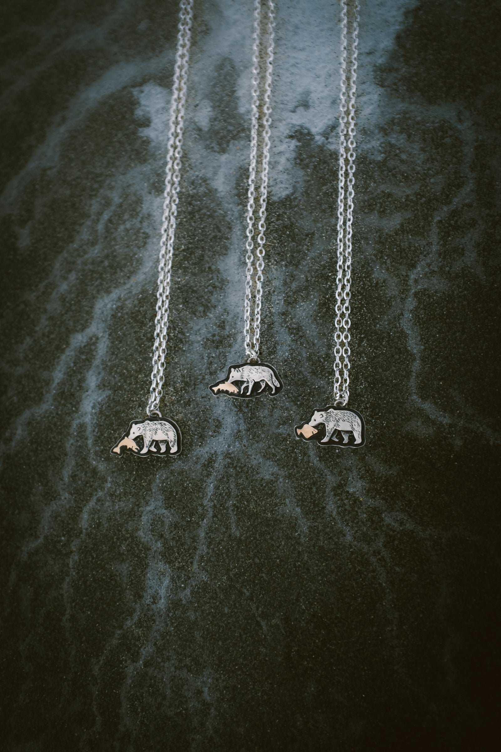 Strung on a 16" chain, this necklace features a small, handmade sterling silver wolf with a pure 14K gold salmon in their mouth. Every component for this pendant is sawn out meticulously by hand, right down to the gills on the gold salmon. The wolf is carefully textured to add fur details & given a slight patina to add dimension.